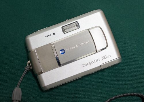 2005年6月発売のコニカミノルタ製コンパクトデジタルカメラ、ディマージュX60。サイズは84x56mmでクレジットカードとほぼ同じ。 https://www.konicaminolta.jp/about/release/2005/0523_02_01.html レンズバリアをスライドすると起動する。レンズは出ない。 …